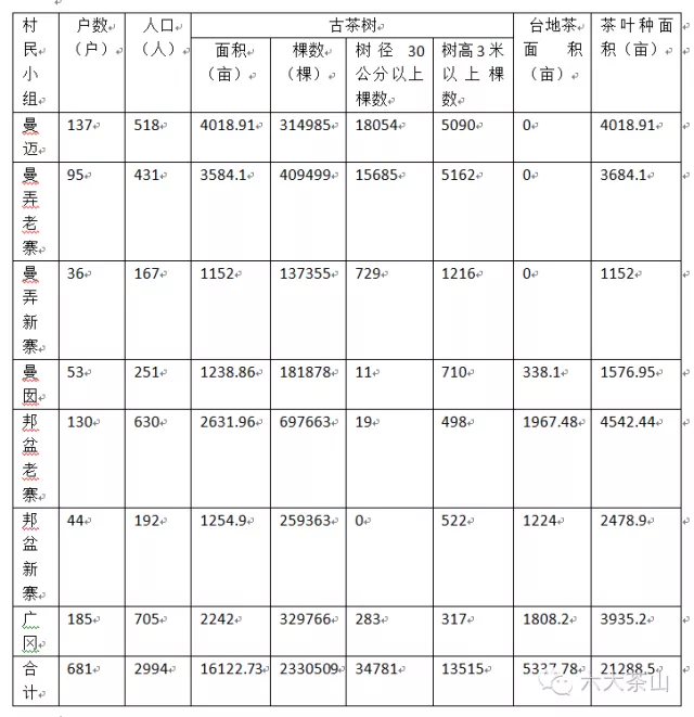 千百年來,人們似乎對賀開十分熟悉,卻又如此陌生。歷史仿佛為賀開留下一段遺憾。讓我們看一組吸引眼球的古茶樹統計數據吧:曼邁314985棵、曼弄老寨409499、曼弄新寨137355、曼囡181878棵、邦盆老寨697663棵、邦盆新寨259363棵、廣岡329766棵,合計2330509棵。