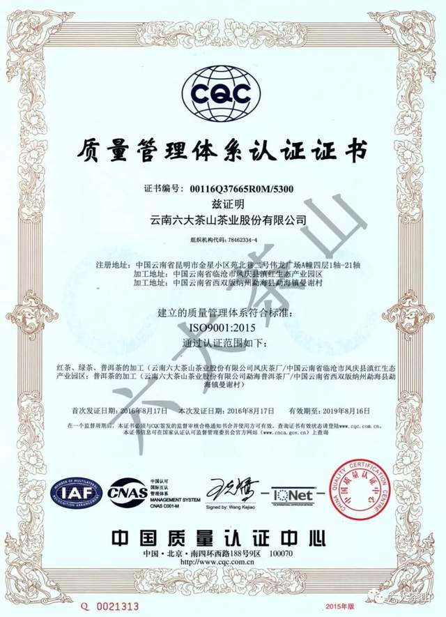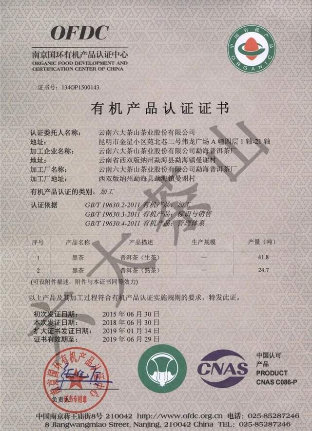 歷年來,六大茶山公司獲得國家有機食品認證,通過SC認證、食品出口衛(wèi)生注冊登記,云南省10大名品、云南省老字號、有機產品認證企業(yè)、出口食品生產企業(yè)、中國茶葉行業(yè)百強企業(yè)、云南首批年份普洱茶質量保薦溯源企業(yè)、云南首款曬青茶質量保薦溯源企業(yè)、HACCP體系認證企業(yè),通過ISO9001質量管理體系認證,ISO22000食品安全管理體系認證。