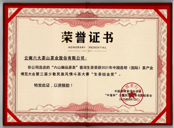 六大茶山“六山御品原茶”普洱生茶榮獲本次斗茶大賽“生茶組金獎(jiǎng)”
